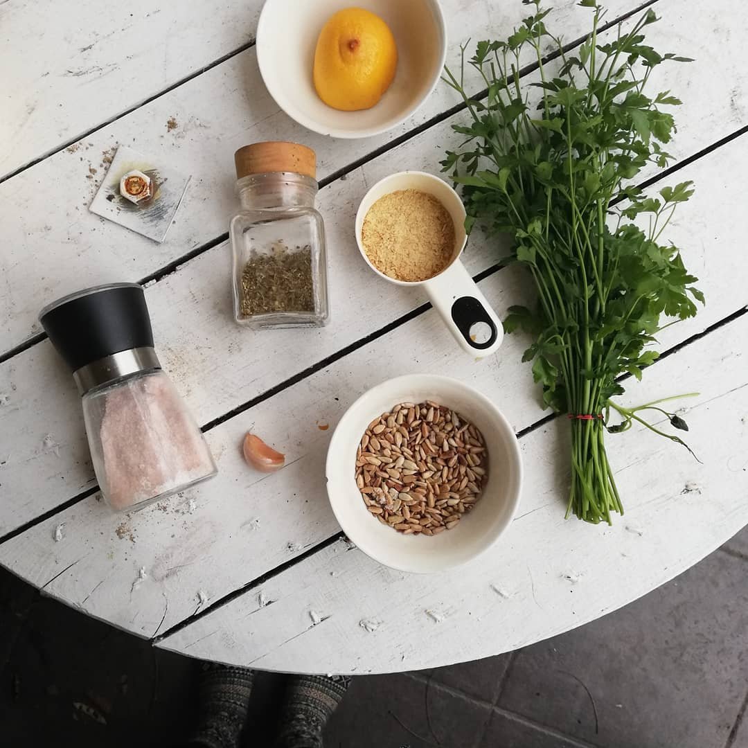 ▫️1/2 lemon- juice + grated skin #realzerowaste ▫️bunch of presley ▫️salt pepper & provencal herbs ▫️1 clove of garlic ▫️1/2 cup of roasted sunflower seeds ▫️1/3 cup of nutritional yeast