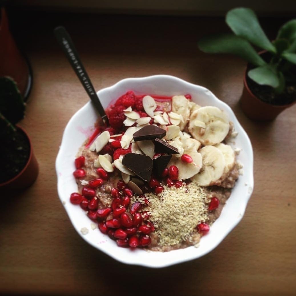 1/2 cup of favourite berries ( my favourite – rasberries) and other fruit orange, more banana or pomegranat + favourite nuts on top and more chocolate!