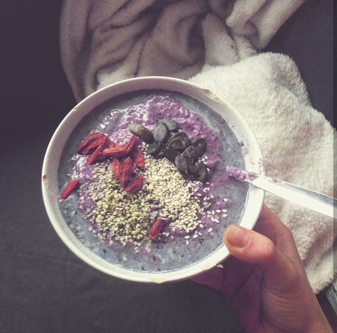 ❇️1/2 cup of frozen blueberries ❇️1 fresh/ frozen banana ❇️cinamon, cardamon ❇️1 cup of vanilla soy milk or other plant-based milk and vanilla protein power ❇️ 3 dried plumps ❇️1 tbs of flax seeds or chia seeds ❇️handful of spinach ❇️1/2 avocado ❇️ 1/2 cup of soaked oats .
