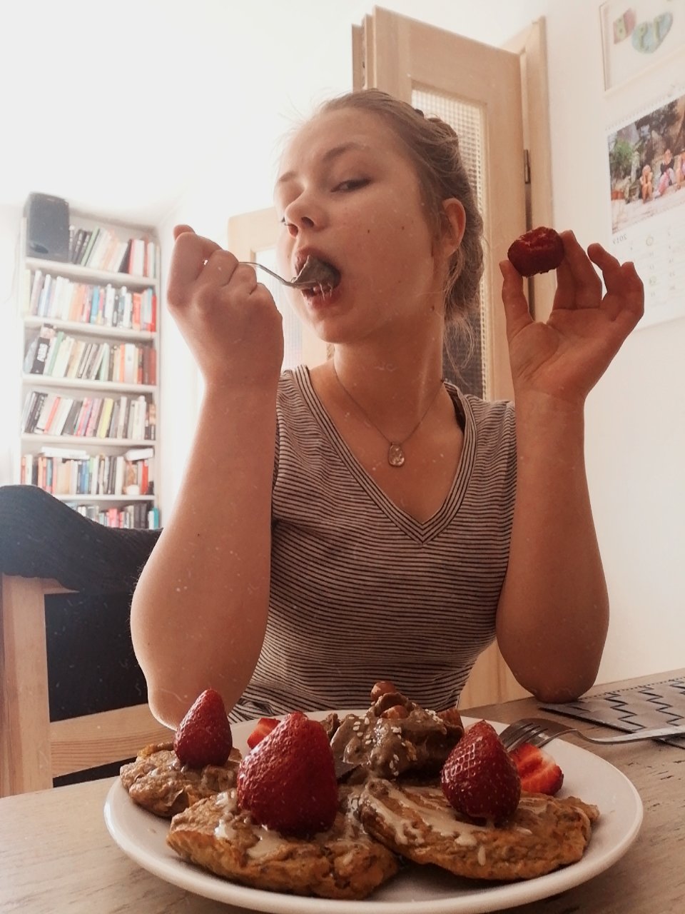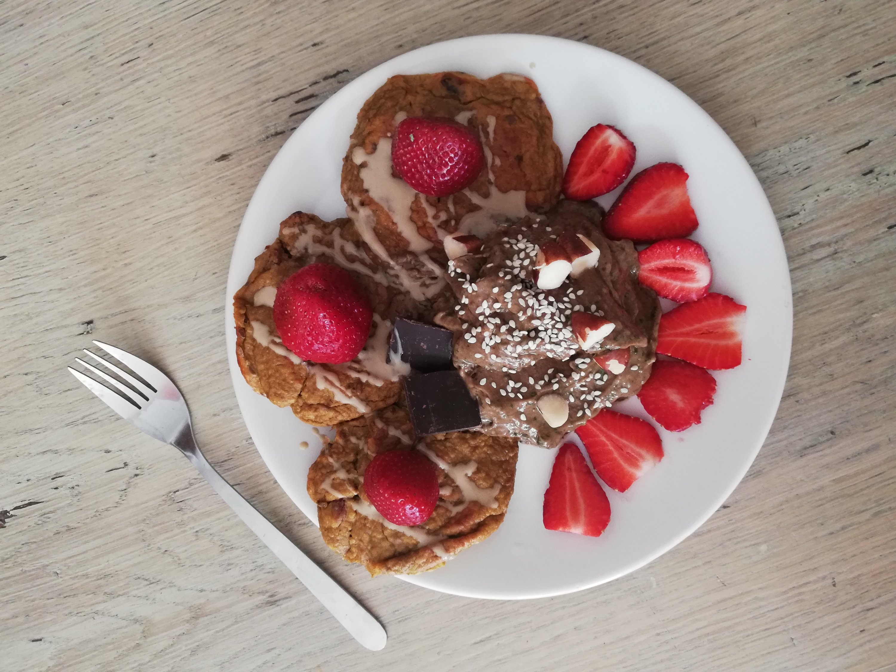 Put on top your favourite additives. I recomend vegan chocolate cream (you can find the recipe in previoust pancake post, fresh berries, tahini and favourite nuts on top. Have a yummy day!