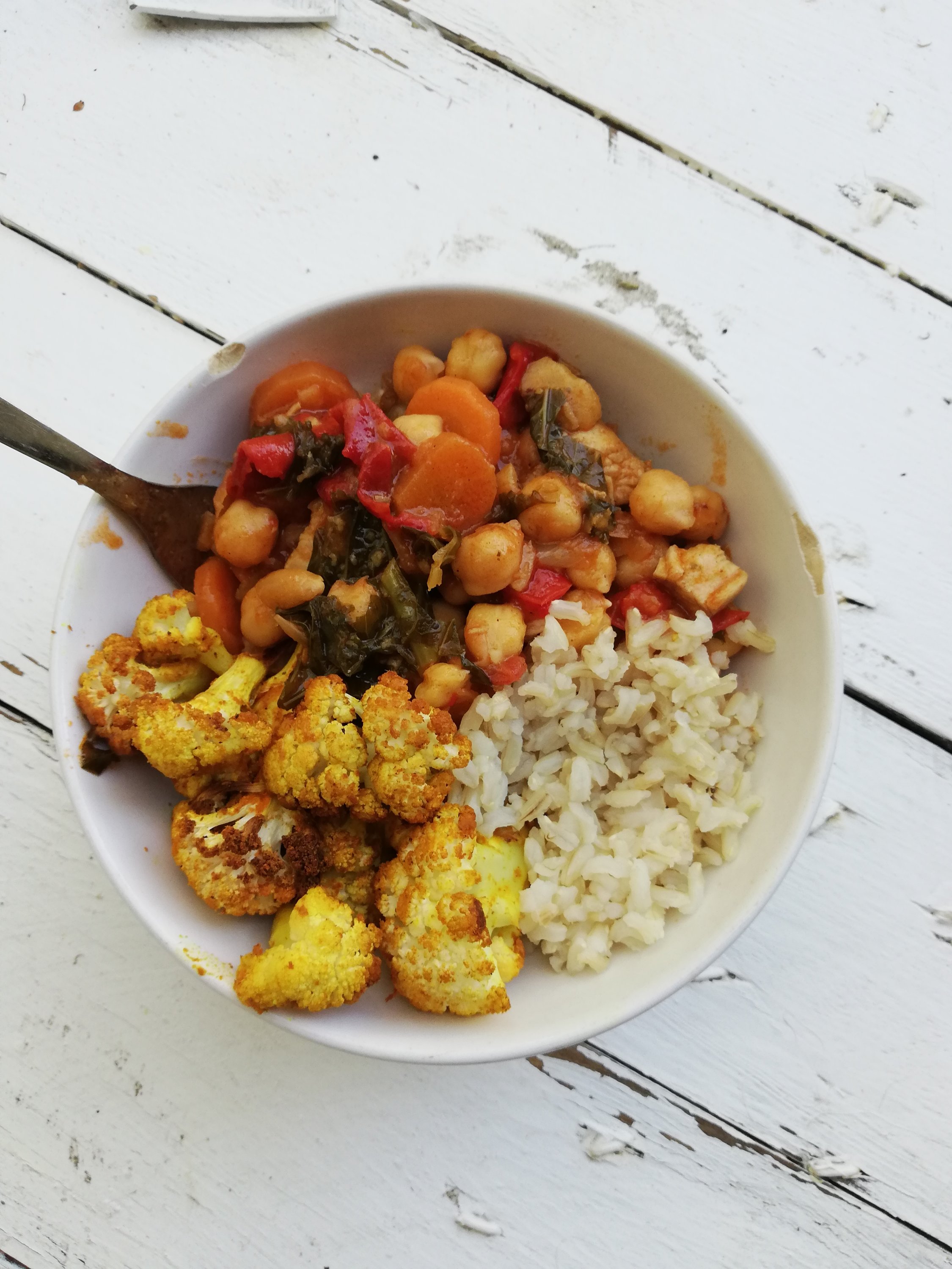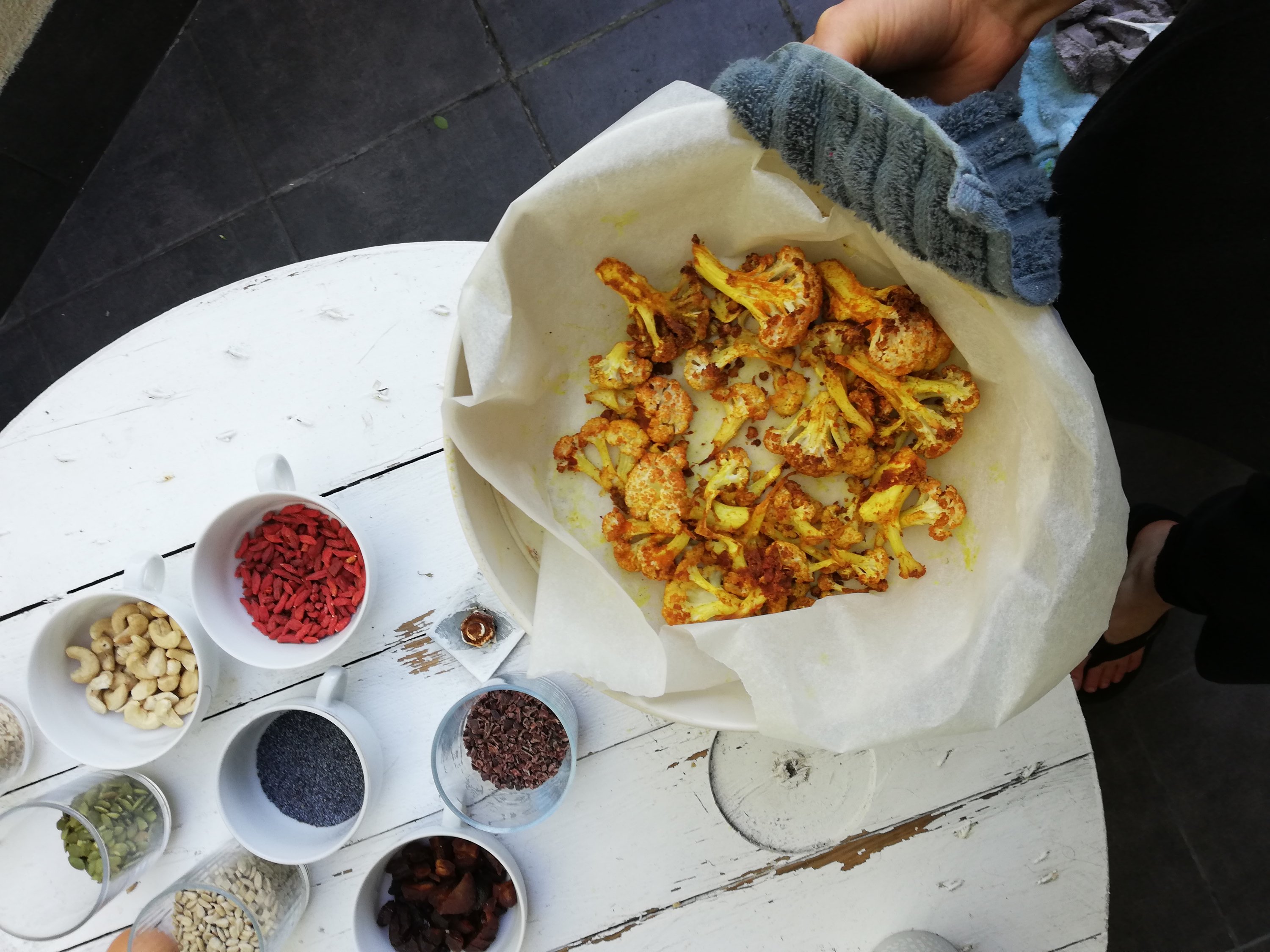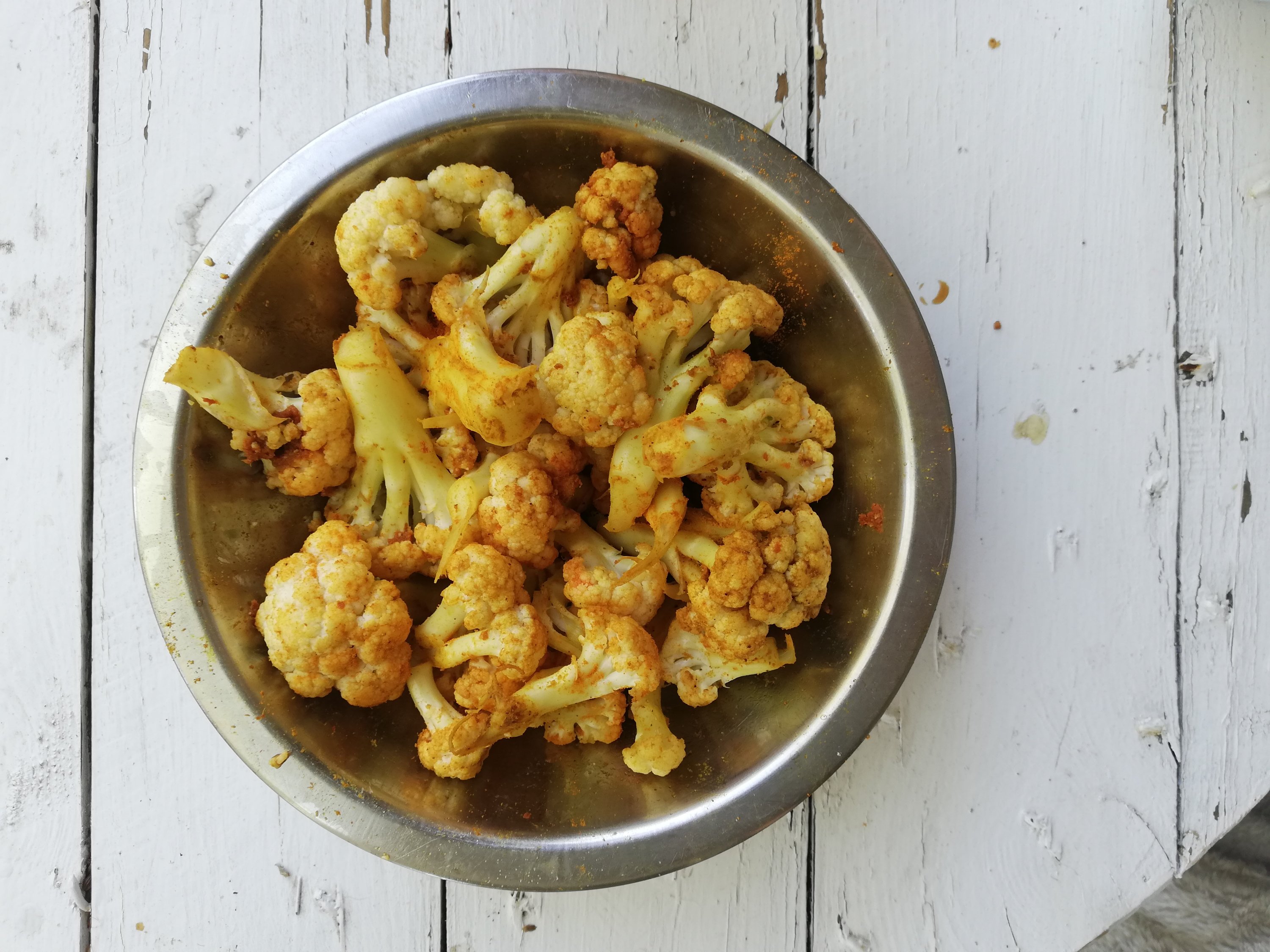 Chop your califlower for smaller pieces, mix all ingredients in a bowl, put on baking form lined with baking paper and bake in 150°C for 15-20 minutes.